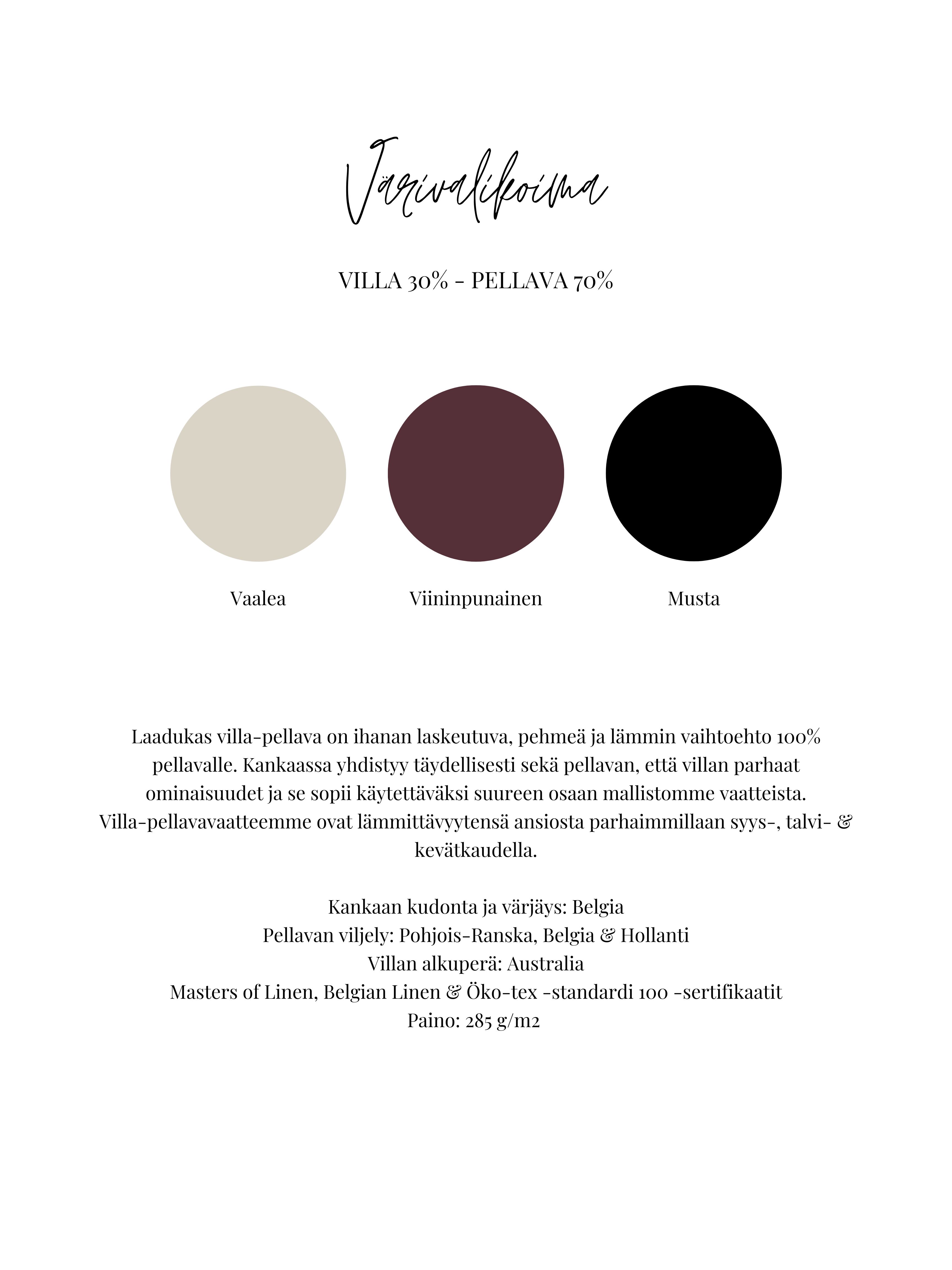 Tuote valmistetaan tilauksesi perusteella pienessä ateljeeompelimossamme Hyvinkään laidalla juuri sinulle. Valmistus- ja toimitusaika on noin 2-3 viikkoa tilauksesta. Saat tarkemman arvion tilauksesi valmistumisesta tilausvahvistuksen yhteydessä.