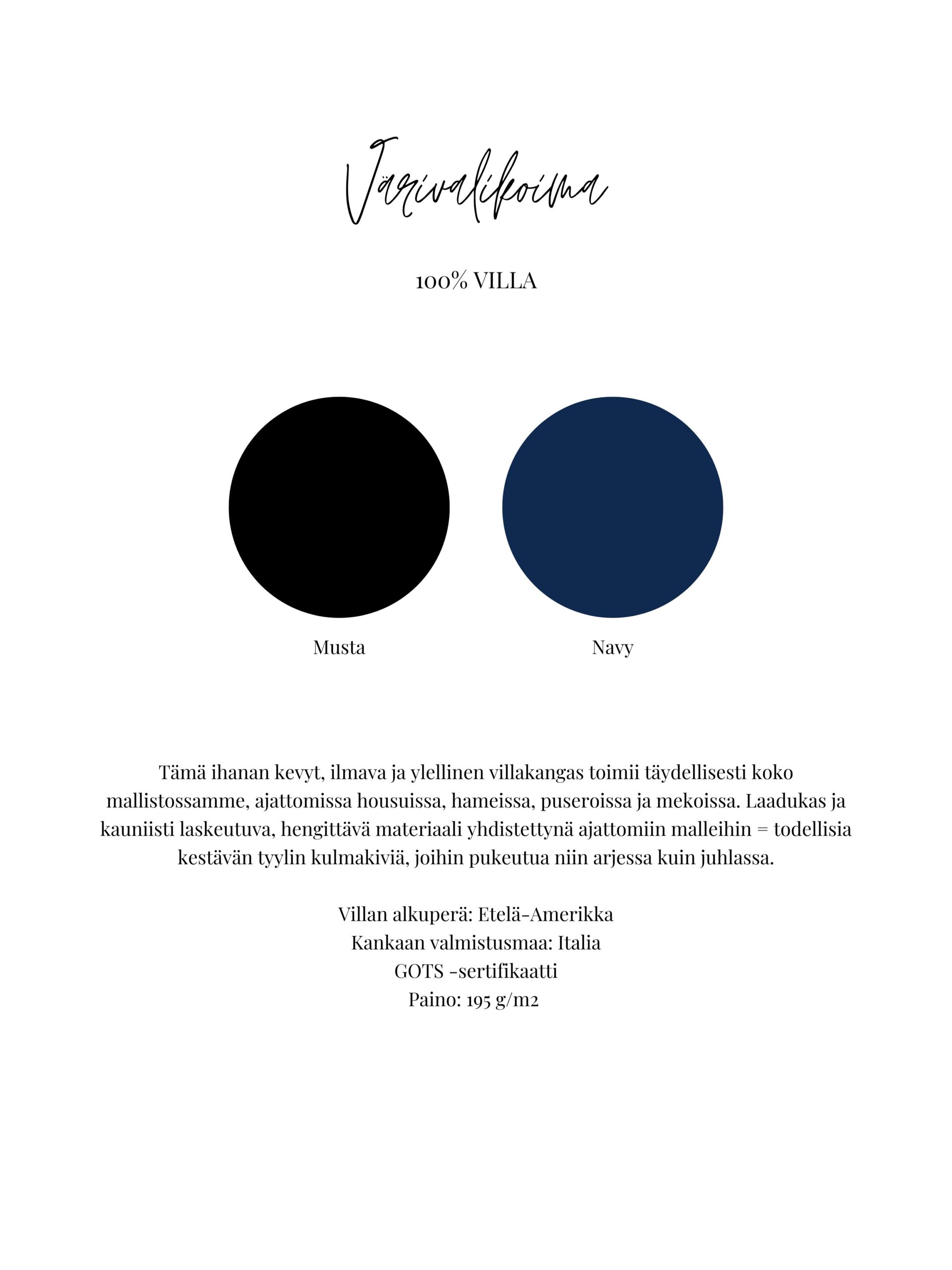 Tuote valmistetaan tilauksesi perusteella pienessä ateljeeompelimossamme Hyvinkään laidalla juuri sinulle. Valmistus- ja toimitusaika on noin 2-3 viikkoa tilauksesta. Saat tarkemman arvion tilauksesi valmistumisesta tilausvahvistuksen yhteydessä.